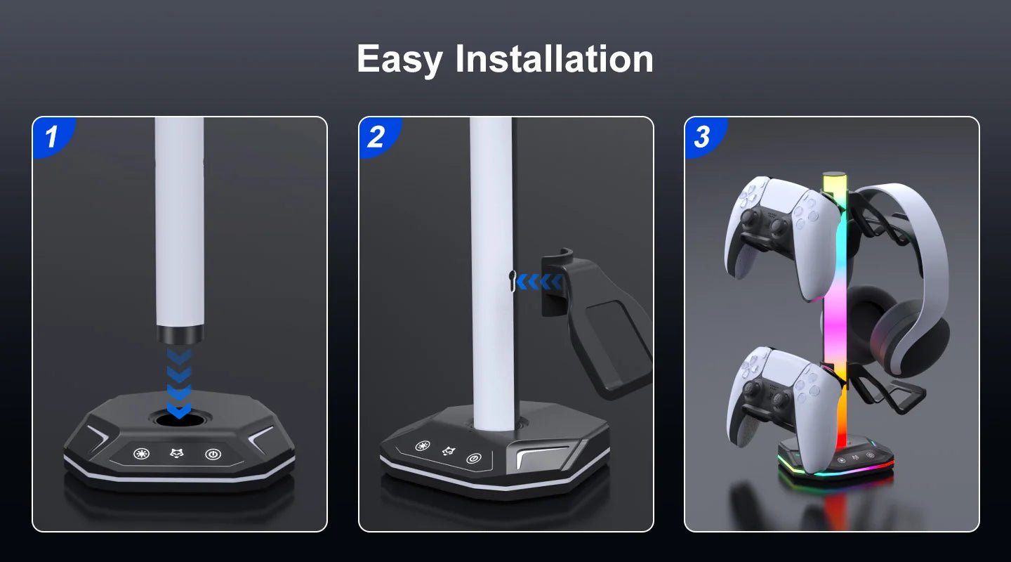 Easy to Assemble:This RGB gaming controller holder is very easy to put together,convenient to place or display the headphones or controllers,keep desk organized.