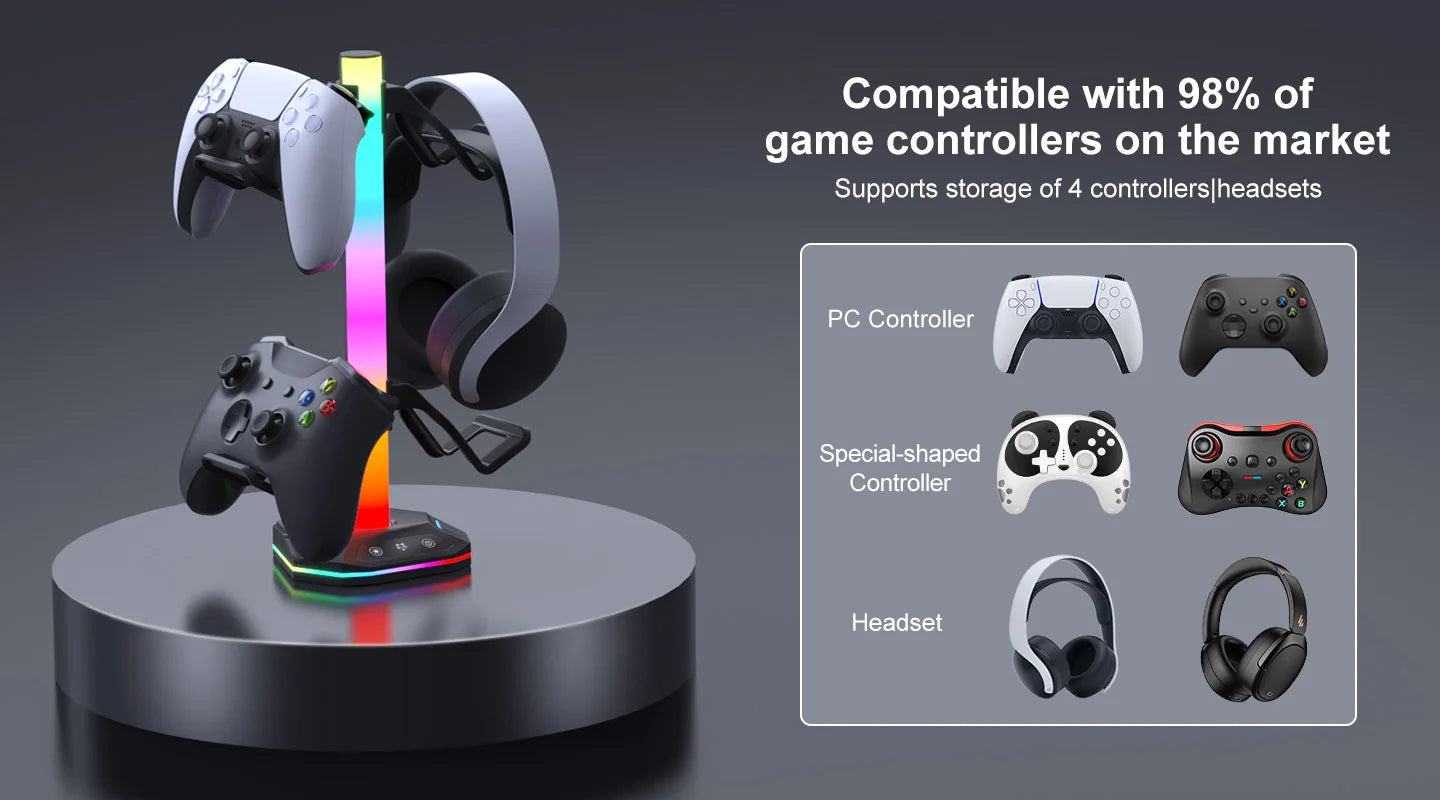 Multi-functional Controller Stand: The RGB Headphone holder equipped with both USB and Type-C ports for easy and flexible connectivity.Charge your controllers directly from the stand, ensuring they are always ready for action.And also perfects for transferring data and other devices charging.